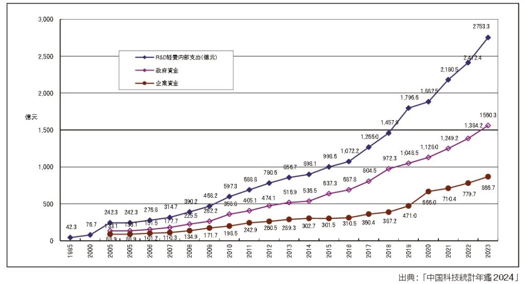 大学における研究開発経費には、研究員の人件費、研究活動に係る経費、固定資産の購入費用等が含まれる。直近のデータとして、2023年のデータは次の通り(出典:中国科技統計年鑑2024)。